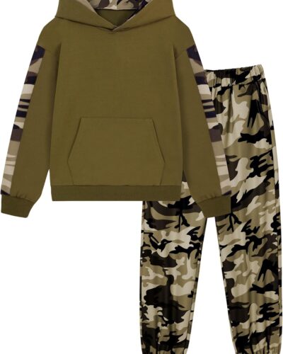 Boys Clothes 2Pcs Long Sleeve Patchwork Graphic Print Hoodie Sweatshirt Leaf Print Camouflage Sweatpants Boy Sweatsuit