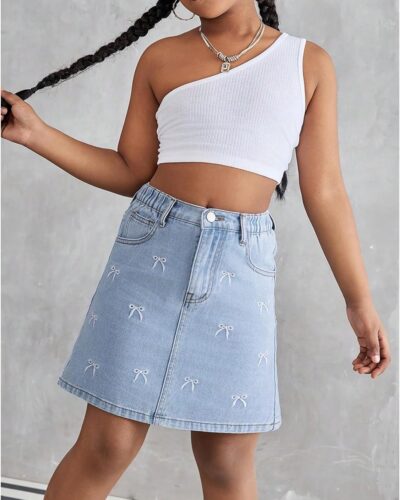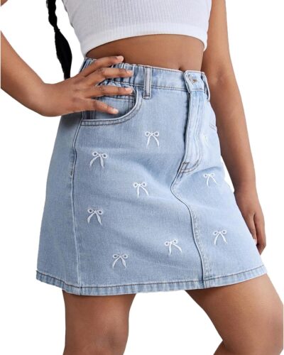 $65.91Girl’s Denim Skirt Bow Embroidery Elastic Waist Y2k Jean Mini Skirts