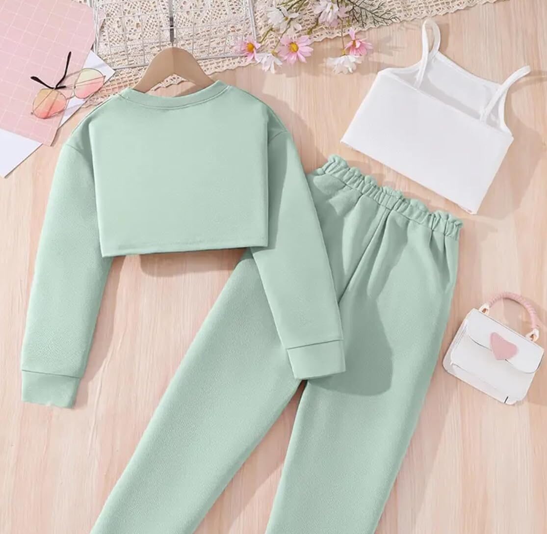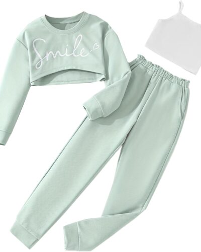 Girls Long Sleeve 3 Piece Outfits Graphic Crop Tee and Cami Top with Pants Set