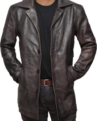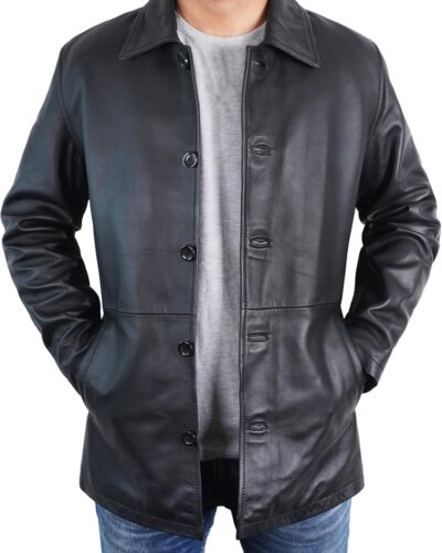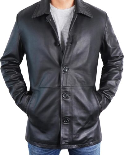 $120.33Men Classic Winter Leather Car Coat 3/4 Length – Button Up Real Lambskin Long Jacket