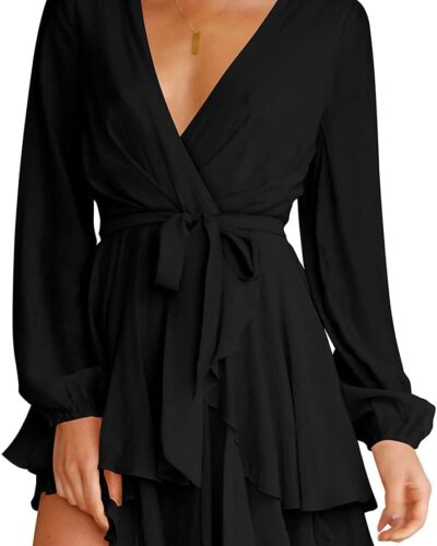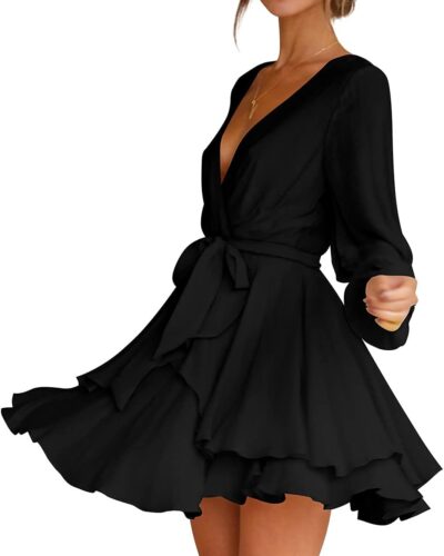 Women Dress Deep V-Neck Long Sleeve Waist Tie Ruffle Mini Swing Skater Dresses