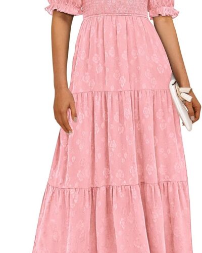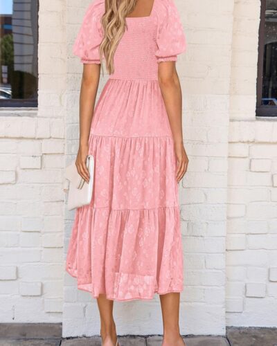 Women Summer Casual Midi Dresses Square Neck Short Sleeve Smocked A Line Floral Flowy Elegant Boho Dress