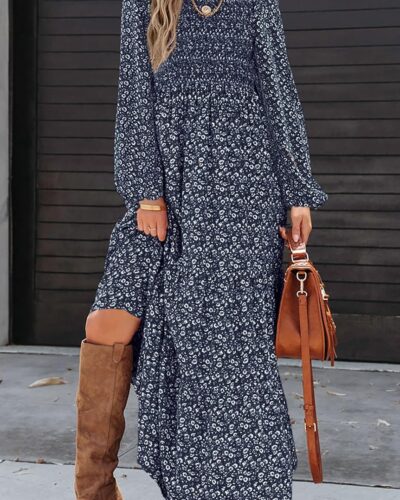 Women Spring Dresses 2025 Long Sleeve Flowy Casual Floral Maxi Dress Crew Neck Smocked Tiered Long Dress