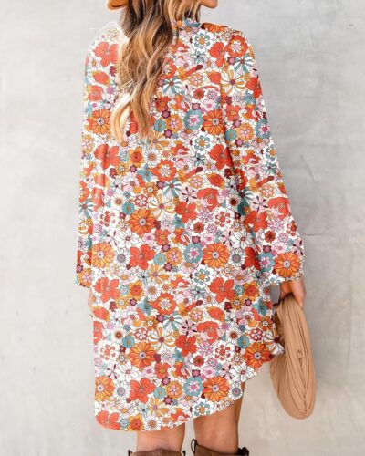 Women V Neck Floral Embroidered Lace Trim Mini Dress Long Peasant Sleeves Flowy Dress Fall Dresses