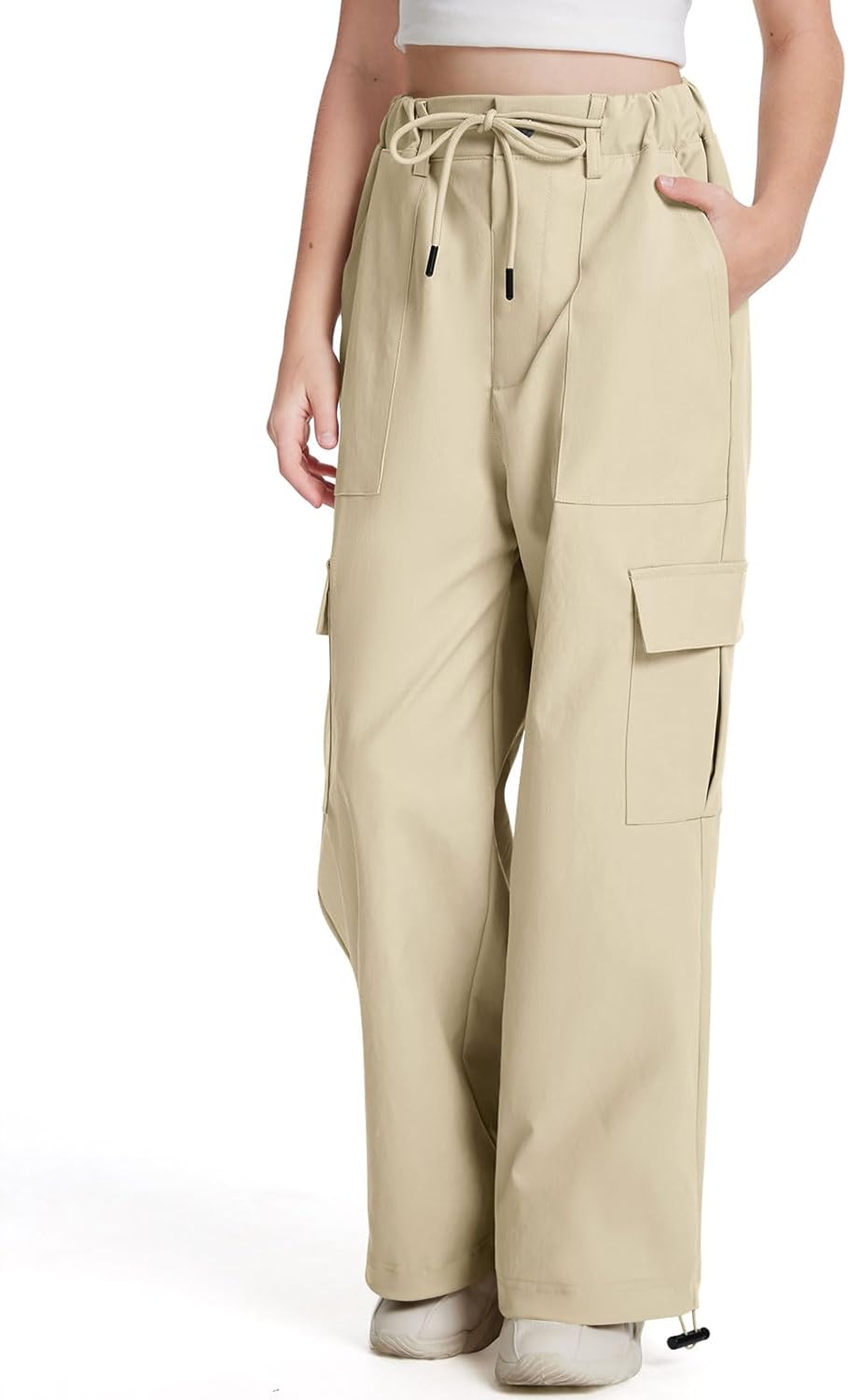 - 【Features】No zipper design, features a snapper, elastic waistband with drawstring, deep side pockets, big functional flap cargo pockets, adjustable pants ankle (jogger or wide Leg), stitching is solid, cargo pants girls can be able to wear them both ways, with trendy wide leg bottom look and if you tighten the bottom it doesn’t look the same for tapered leg pants. Wide-leg silhouette gives girls a modern and fashionable look that is perfect for streetwear or casual occasions
