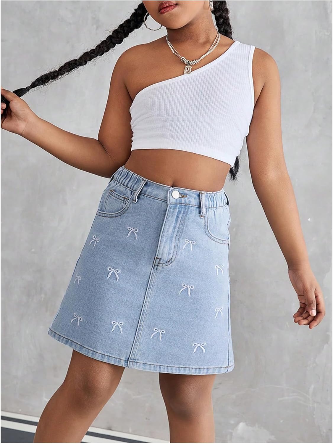 - Features: Slant pocket, embroidered, zipper, button front, cute skirt for girls