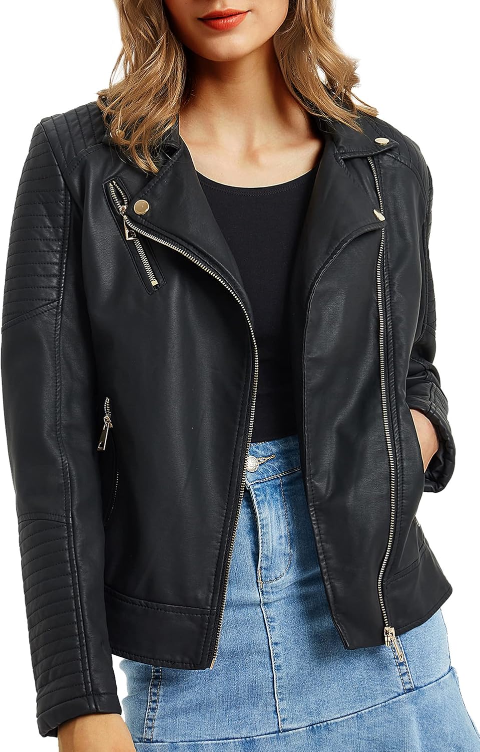 • Stand Collar: Our faux leather jacket for women is designed with a stand collar that not only provides a modern edge but also offers a comfortable fit around the neck. The collar’s sleek design is perfect for layering and can be worn up for added warmth
