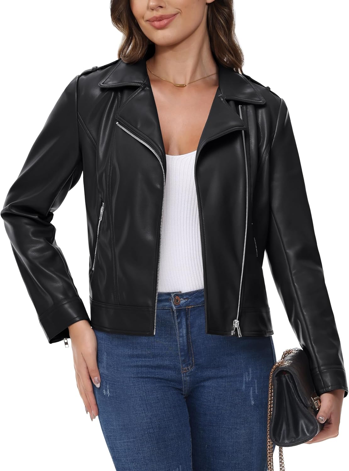 - Timeless Appeal: Embrace the timeless appeal of the leather jacket, especially as the weather cools and the seasons change. Stylish and cute, a leather jacket is a wardrobe must-have you’ll reach for season after season.